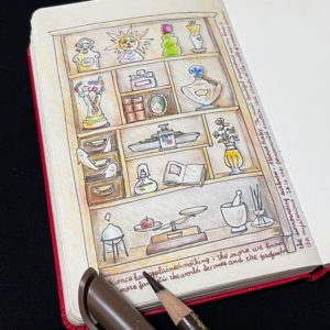ペンと色鉛筆でおやつ絵日記を描きます。