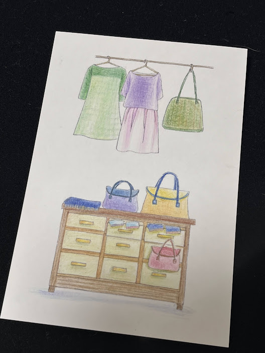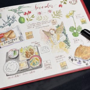 ペンと色鉛筆でおやつ絵日記を描きます。