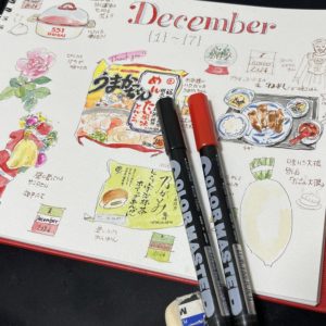 ペンと色鉛筆でおやつ絵日記を描きます。