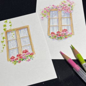 ゼラニムの描き方、レース風の描き方、窓の立体感の出し方です。