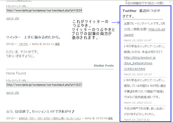 ブログとツイッターが連動するようになりました 2010/3/11 木曜日 BeltaLeave a comment ブログとツイッターが連動するようになりました。 ブログを更新すると、 自動的にツイッターにも表示されます。 また、ツイッターのつぶやきも 右のサイドバーに表示されます。 サイドバーには、ブログもツイッターも 両方が表示されることになります。 これからも、たくさんの情報を発信していきます。 お楽しみに♪ >Yさま 設定、サポート、感謝です。 (in 大阪)