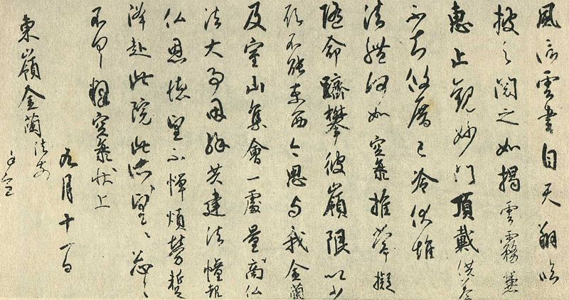 風信雲書、天より翔臨す。 2010/4/11 日曜日 BeltaLeave a comment 久しぶりに好きな言葉です。 風信雲書、 天より翔臨す。 (空海) 最澄宛の書翰「風信帖」の冒頭の名句です。 漢文で書けば 「風信雲書 自天翔臨」 フウシン・ウンショ・ジテン・ショウリン 意味は、 「風のごとき、雲のごときあなたからのお手紙、 それが天から舞い降りるが如くに目前に届きました」 風、雲、翔、大きな世界が広がります。 国宝「風信帖(ふうしんじょう)」 (Wikipediaからお借りしました) 出典は、「空海、言葉の輝き」 楽天 (in 大阪)