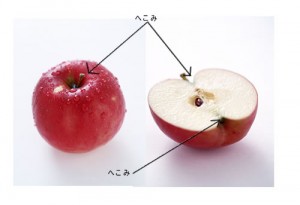 リンゴの特徴は、丸くて、上と下が凹んでいること。