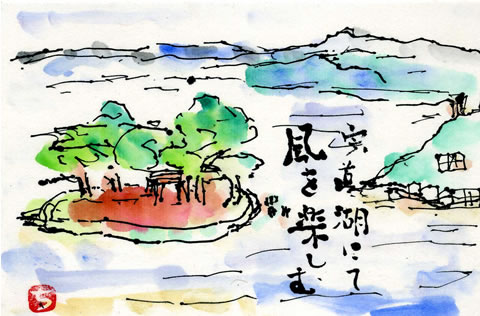 福間さんからの絵手紙 宍道湖の風 2008/5/28 水曜日 BeltaLeave a comment 雲南市の福間千代子さまから、 絵手紙をいただきました。 島根県東部の宍道湖という湖です。 浮かんでいるのは嫁が島。 爽やかですね。 「風を楽しむ」とありますが、 まさに、絵から風が吹いてきます。 湖の紫ががった青と、 嫁が島の緑。 一服の清涼剤のようですね。スッキリします。 しばらく机の上に飾っておきましょう。 Beltaにいつも風が吹きますように。