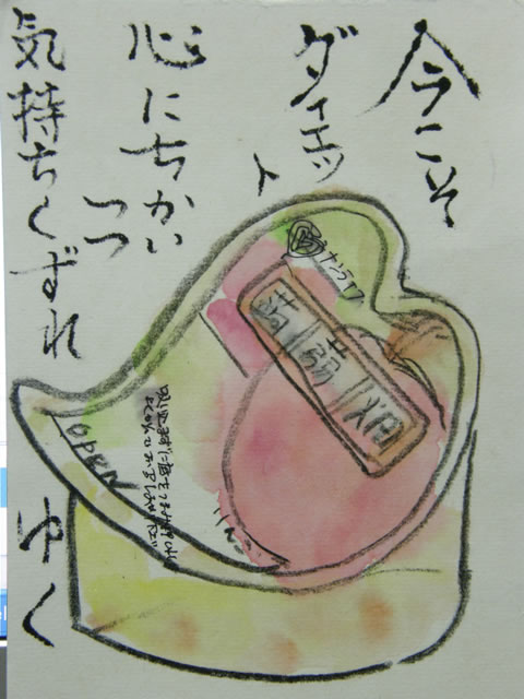 福間千代子さんからの絵手紙 蒟蒻畑 2008/8/12 火曜日 BeltaLeave a comment 夏になっても食欲旺盛。 体重計を気にしつつも、 夏ばて防止を言い訳に、つい手が伸びるのは… そんなオトメゴコロを、雲南市の福間様が 絵手紙にして送ってくださいました。 こんにゃくゼリーの蒟蒻畑、ですね。 「気持ちくずれゆく」に、くすっとしちゃいます。 淡いピンクが、女の子っぽくって可愛らしいですね。 福間さま。 いつも素敵な絵手紙ありがとうございます。 また、机のそばに飾らせていただきますね。