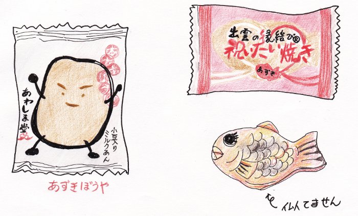 今日のおやつ。 2011/9/18 日曜日 BeltaLeave a comment 先日の講座でお客さまからいただいたおやつ。 今日、おいしくいただきました。 あずきぼうやは、小豆の入ったミルクあん。 ずっしりと重くておいし。 祝いたい焼きは、 食べてから書こうとしたら、たい焼きの顔、忘れてた(笑) 想像で描いています。 >Tさま ごちそうさまでした。 ありがとうございます。 (in 松江)