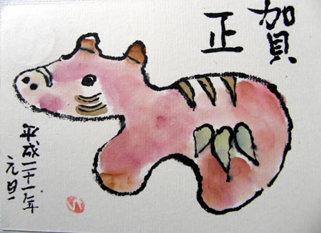 福間千代子さんからの絵手紙 丑 2009/1/8 木曜日 BeltaLeave a comment 雲南市の福間千代子さまが、 年賀状として、絵手紙を送ってくださいました。 干支の丑をくるりと一筆書きのように。 何と言ってもステキなのは、目。 かわいい目が作り出す表情は、 生きているかのようですね。 ちょっぴり上を向いた顔が、 真剣であり、笑っているようであり。 福間さま、いつもありがとうございます。 この絵も、とっても大好きです。 今年もどうぞよろしくお願いいたします。