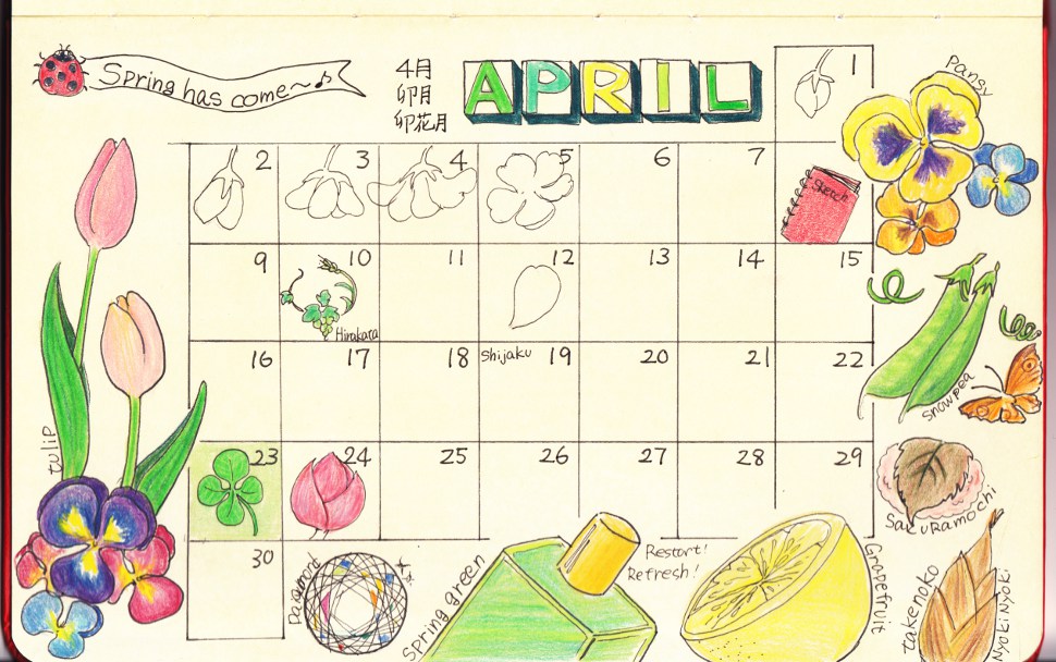 4月のカレンダー 2012/4/1 日曜日 BeltaLeave a comment 今日から4月。 4月のカレンダーです。 春爛漫。 たくさん描きすぎましたね(笑) 4月の石や香りです。 石:ダイヤモンド ボトル:スプリンググリーン 香り:グレープフルーツ それぞれの詳細は後ほど。 (in 松江)