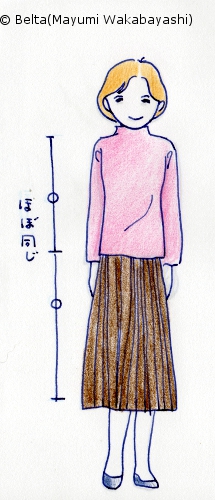 上着とスカートが同じ長さ。