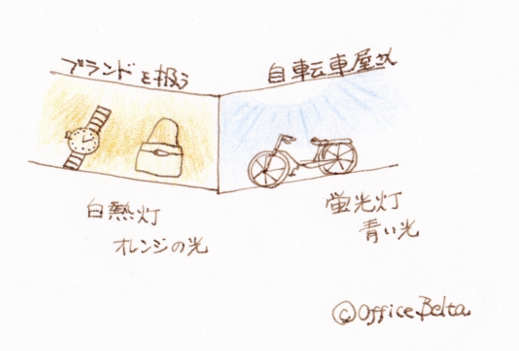 灯りの違い 2014/11/8 土曜日 BeltaLeave a comment ご近所で見つけた隣接した2件のお店、 1つはブランド品を扱うお店、 1つは自転車店。 ブランド店の灯りは白熱灯、オレンジ色の暖かい光です。 自転車店は蛍光灯、青白い光です。 白熱灯の灯りはリラックスを、蛍光灯の光は緊張やお仕事モードを促します。 お客さまにリラックスしていただき、 高級感を促したいブランドのお店は白熱灯、 お仕事モードを促したい自転車店は蛍光灯。 お店の目的による照明の使い方の良い例だと思います。 (in 大阪)