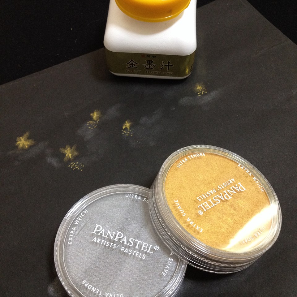 金色の墨汁でお星様、それにパンパステルのゴールドを加えてキラキラ~。