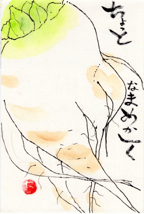 福間千代子さまの絵手紙 なまめかしく 2015/12/18 金曜日 BeltaLeave a comment 島根県雲南市の福間千代子さまから、 季節の絵手紙が届きました。 許可をいただき、掲載させていただきますね。 受け取った瞬間、くすっと笑っちゃいました。 こんな大根、時々出会いますよね。 なまめかしくて、なんともユーモラス。 色白ですべすべしたお肌の大根、いろっぽ~い♪ 福間さま いつもありがとうございます! これから大根を見ると、いただいた絵手紙を思い出しそうです♪ (in 松江)