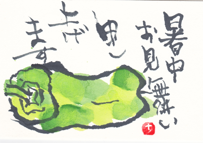 福間さんの絵手紙 暑中お見舞い 2016/8/7 日曜日 BeltaLeave a comment 雲南市大東町の福間千代子様から届く季節の絵手紙。 許可をいただいて掲載させていただいています。 なんと元気が出そうなピーマン! しゅわっと青い香りが漂いそうです。 このところ忙しかったので、くたっとしておりましたが、 一気に元気になりました。 色や形、文字が元気をくれるんですね。 福間さま いつもありがとうございます。 部屋に飾って眺めております。 (in東京)