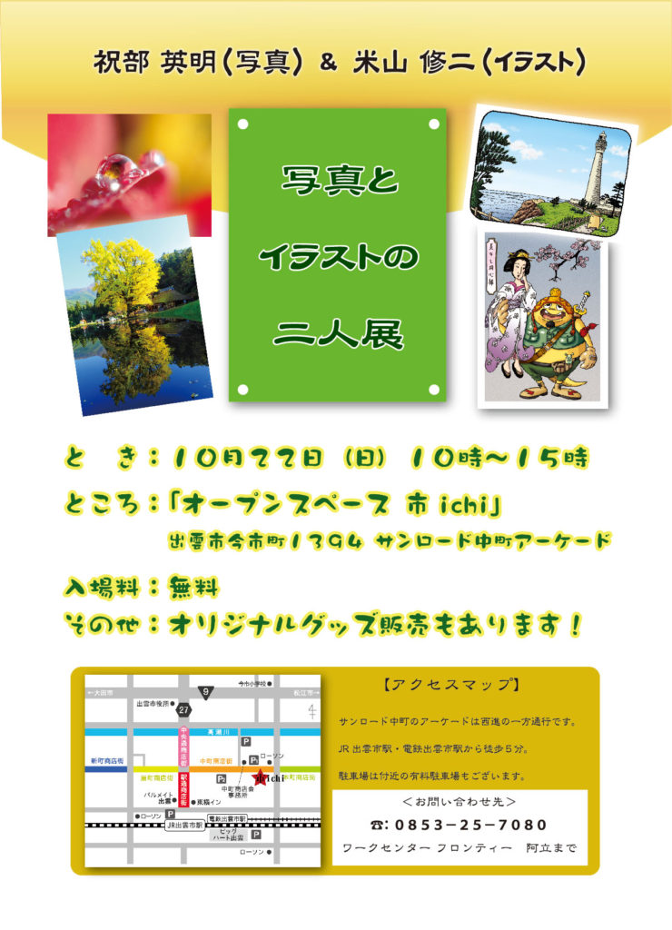 米山さんの展示会のお知らせ(出雲) 2017/9/23 土曜日 BeltaLeave a comment 出雲市の友人、イラストレーターの米山さんの展示会のお知らせです。 今回、写真家の方とコラボだそうです。 10月22日(日)です。 お近くの方はぜひ♪