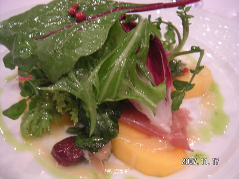 オードブルは、柿とパルマの生ハムのサラダ仕立て