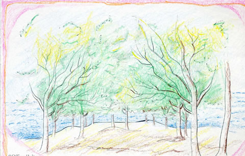 絵の中では、木々の上の方に黄緑が描かれています。